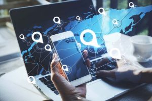 Geolocation and distributed data concept with hologram world map model and white pinpoints on man hands using cell phone and laptop backdrop